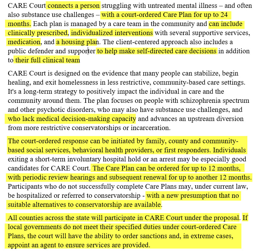 I have attached below a clip from the Governor’s fact sheet discussing the new proposed California CARE Court. I added the yellow. These are difficult situations and issues. Any proposed improvement is welcome. I note, however, that when the Legislature works on this legislation they consider that this proposal sounds very close to a conservatorship or a limited conservatorship. It would be a State action (legislation and Court) that limits or restricts a person’s freedoms and personal decision making, and also that perhaps results in forced or ordered medications and living conditions.