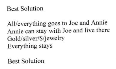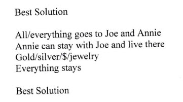 Then you must ask: why would Deb consider ending her own life to be the Best Solution for her at that time, and what could have/should have occurred or been done different at that time to avoid the tragedy not only at that time and but also long-term? Deb had discussed with several of us getting a divorce attorney. The supposed note does not mention ending her own life, and was not on Deb or with her (the pad was found in Deb’s car), and other provisions in the supposed note are contradicted by Deb’s texts, videos, and conversations. Annie is Deb’s beloved Poodle, who Deb named after our birth mother – Deb had communicated to several of us to whom she would want Annie to go if Deb should pass (i.e., friends, Cousins, or me). The estate planning trust to which Deb had referred (to several of us) was not or could not be located. The three affidavits contain a lot of information, including texts from Deb. Also for clarification, I refer to a “supposed note” because neither the original of the note or pad, or a copy, was provided or produced, and there was no handwriting or other analysis done or allowable – thus, the supposed note and pad could not be inspected, and they are not vetted.