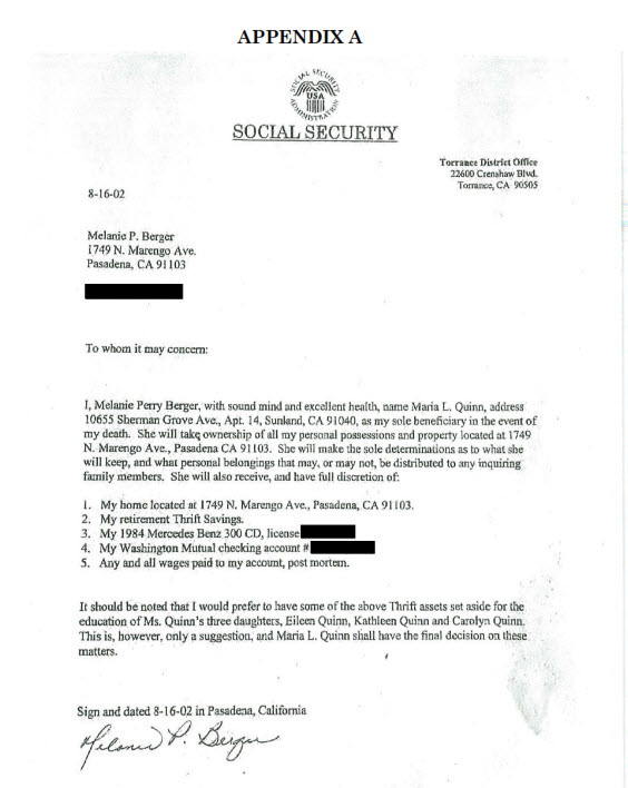 In Estate of Berger, a new California case, the California Court of Appeal, Second District (May 25, 2023, B321347) has held that an 18-year-old typed, signed letter, that is not witnessed or notarized, is decedent Melanie Berger’s valid will. The typed letter is dated August 16, 2002. Melanie died eighteen years later. Below I have pasted a screenshot of the introduction summary from the decision in Estate of Berger and a screenshot copy of the August 16, 2002, letter which is attached to the decision as an exhibit, and I have also attached below a pdf copy of the full decision in Estate of Berger.