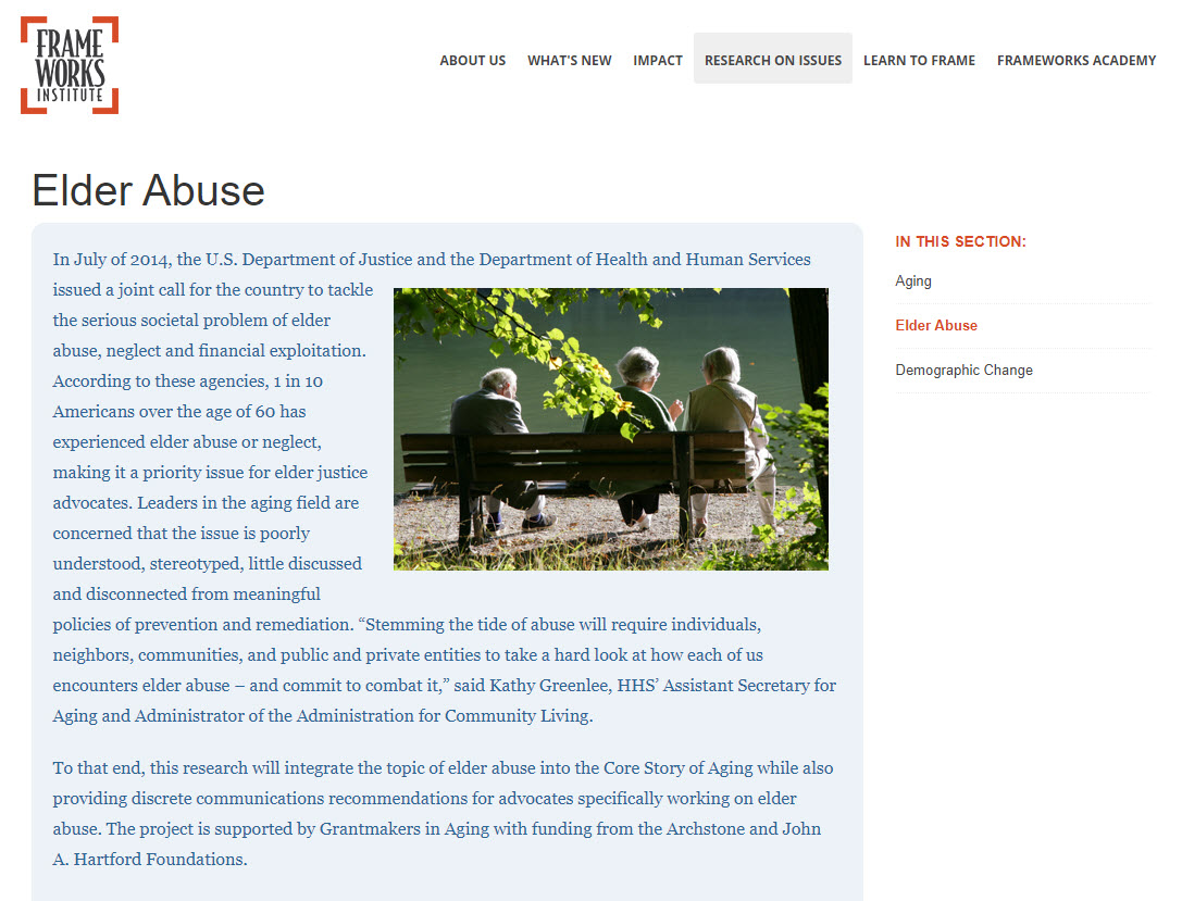 Here is the link to the Frameworks Institute, Elder Abuse website page, http://frameworksinstitute.org/elder-abuse.html