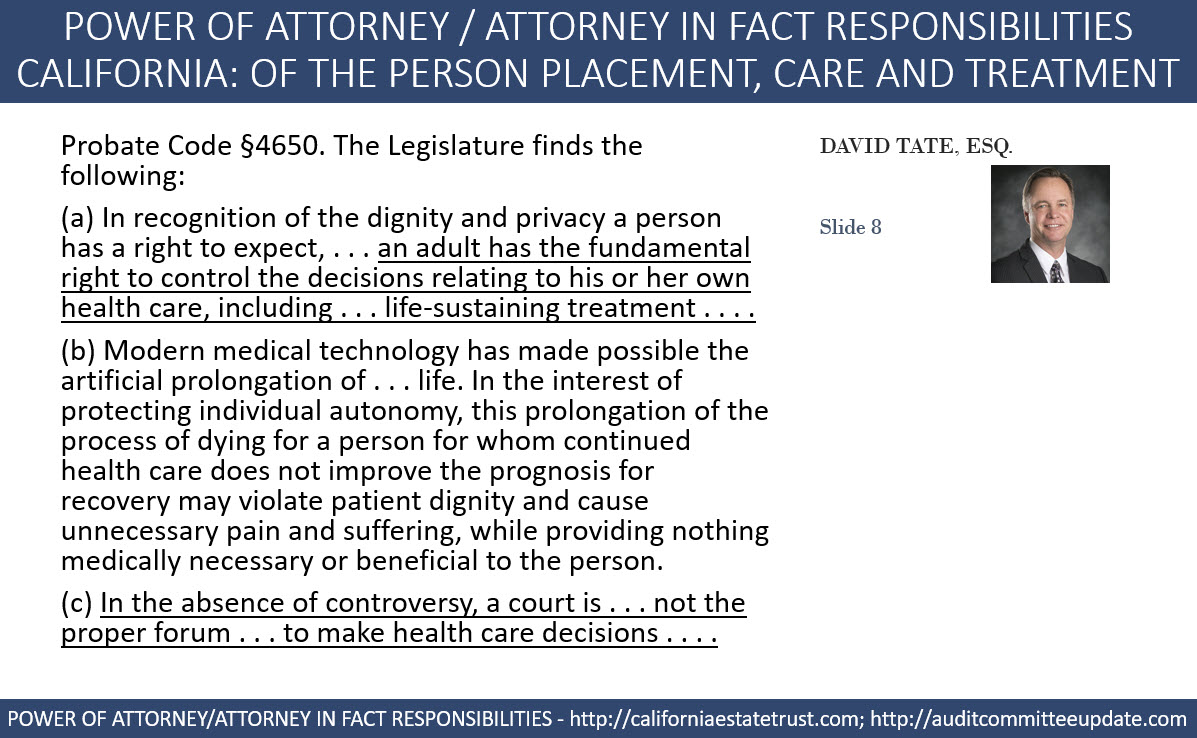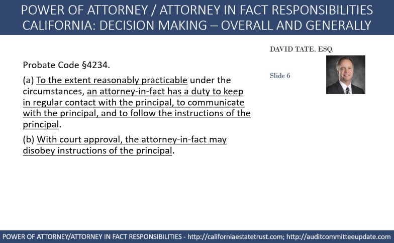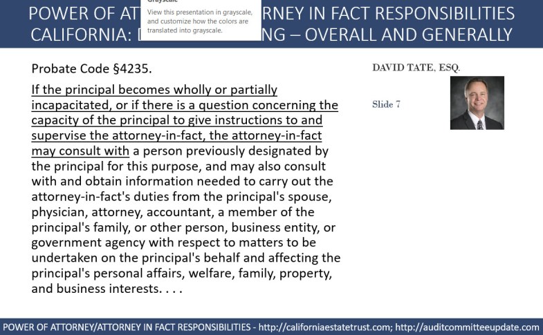 I seldom see discussions about power of attorney, principal, and attorney-in-fact responsibilities and rights. I am providing some of my power of attorney presentation slides. Click on the following link for my prior post with my slide numbers 3, 4, and 5 https://wp.me/p1wbl8-tK. Below in this post I have provided slide numbers 6, 7, and 8. Additional slides will be provided in subsequent posts.