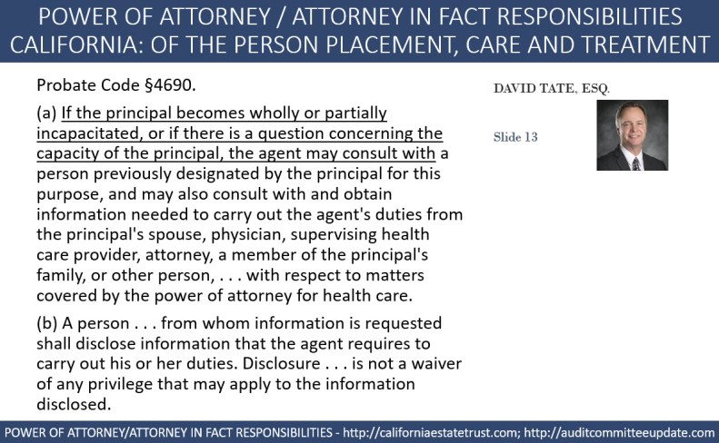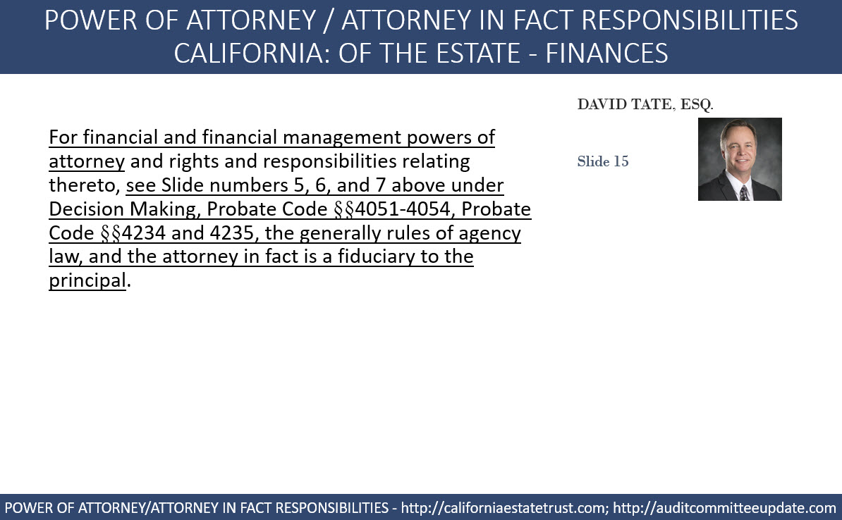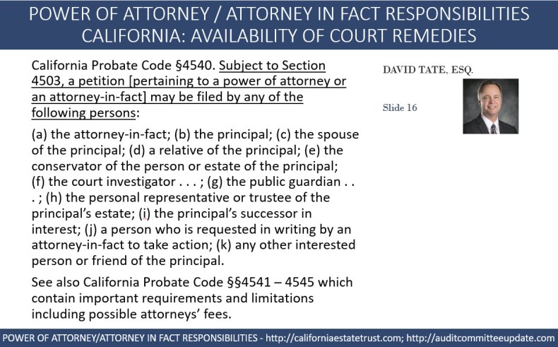 I seldom see discussions about power of attorney, principal, and attorney-in-fact responsibilities and rights. I am providing some of my power of attorney presentation slides. Click on the following links for my three prior posts containing my slide numbers 3, 4, and 5 https://wp.me/p1wbl8-tK, slide numbers 6, 7, and 8 https://wp.me/p1wbl8-u5, and slide numbers 9, 10, 11, and 12 https://wp.me/p1wbl8-uj. Below in this post I have provided slide numbers 13, 14, 15, and 16, which are the remaining slides that I am posting.