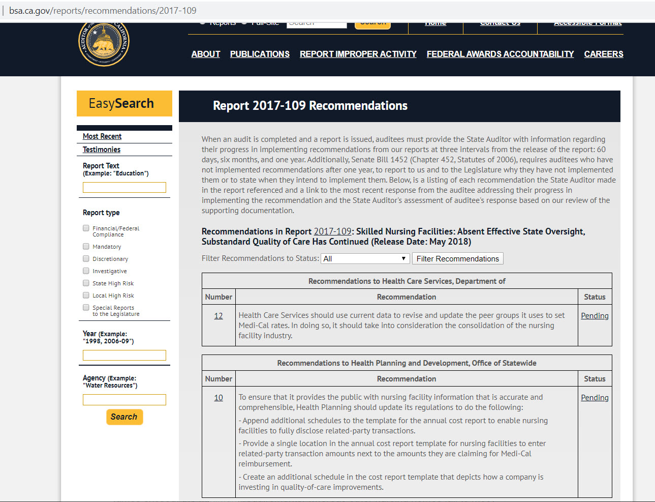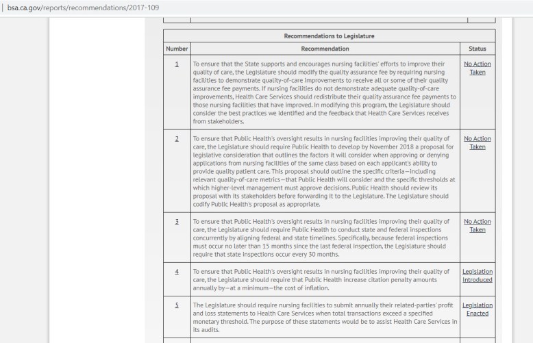 Everyone would agree that nursing home residents individually and as a group are vulnerable and are dependent on other people for their health, care, and well-being. So I came across the below status update by the California State Auditor about recommendations (apparently made in 2018) for improved oversight of substandard nursing home conditions, and it is with great disappointment that apparently none of the recommendations have actually come to be.